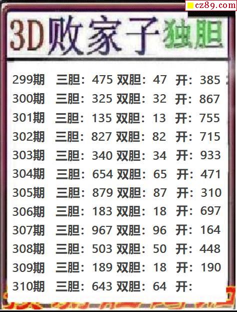 败家子独胆2025310期3d图谜